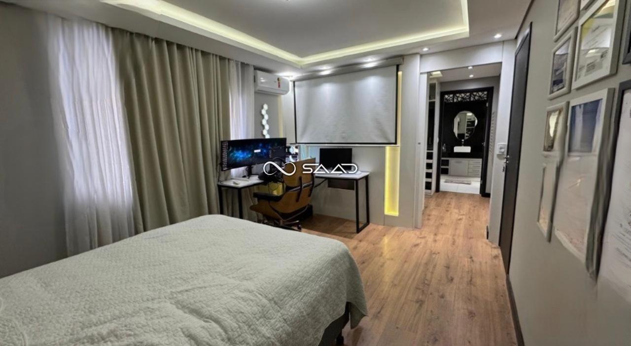 No pavimento superior, três suítes encantam pelo conforto e pela amplitude. A suíte master é um verdadeiro refúgio particular — climatizada, com closet duplo, banheiros independentes Sr. e Sra., frigobar e mobiliário sob medida.