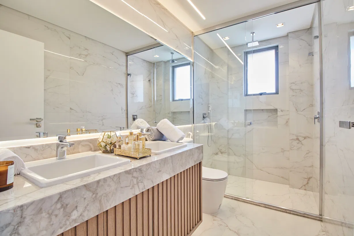 Suíte master com ducha de teto e cubas duplas